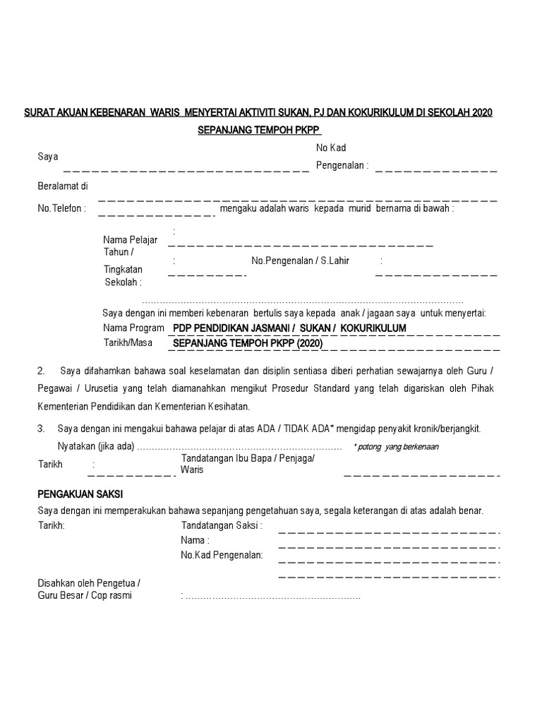 Contoh borang deklarasi untuk murid aktiviti luar. Contoh Surat Tidak Rasmi Kepada Ibu Bapa have an image associated with the otherContoh Surat Tidak Rasmi Kepada Ibu Bapa It also will feature a picture of a kind that might be seen in the gallery of Contoh Surat Tidak. SURAT AKUAN KEBENARAN WARIS MENYERTAI AKTIVITI SUKAN PJ DAN KOKURIKULUM DI SEKOLAH 2020 SEPANJANG TEMPOH PKPP.